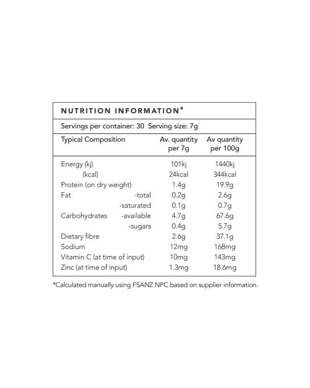 Made with: Organic Greens blend (Wheatgrass, Barley grass, Alfalfa grass, Spirulina, Chlorella)*, Organic Jerusalem Artichoke Inulin powder*, Organic Sprouted Pea Fibre powder*, Organic Collard Green powder*, Organic Kale leaf powder*, Organic Spinach leaf powder*, Organic Liquorice root powder*, Organic Broccoli Sprout powder *, Organic Sprout blend (Organic Amaranth Sprout, Organic Quinoa Sprout, Organic Millet Sprout, Organic Buckwheat Sprout, Organic Chick Pea Sprout, Organic Lentil Sprout, Organic Adzuki Sprout, Organic Alfalfa Sprout, Organic Flax Sprout, Organic Sunflower Sprout, Organic Pumpkin Sprout, Organic Chia Sprout, Organic Sesame Sprout)*, Organic Grape juice powder*, Liver Support (Dandelion, Milk Thistle) herbal extract blend, Green Kiwi Fruit powder, Organic Ginger powder*, Organic Rosemary powder*, Organic Acerola powder*, Natural Lime flavour, Inactivated nutritional yeast, Zinc powder. *certified organic ingredients